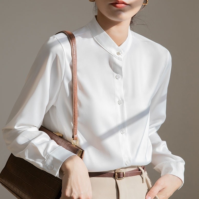 安い価格レディース トップス シャツ ブラウス 前開き Yシャツ 長袖 袖あり スタンドカラー スリム 細身 フォーマル スマート フェミニン ボタン パール 薄手 かわいい 大人可愛い きれいめ シンプル