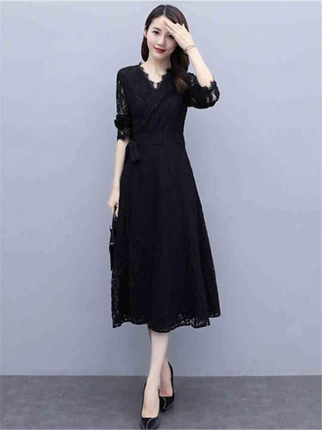 【激安開催】ワンピース ドレス レディース Vネック レース 総レース 花柄 かぎ編み 薄い 透け感 長袖 袖あり ミモレ丈 ロング カシュクール ウエスト